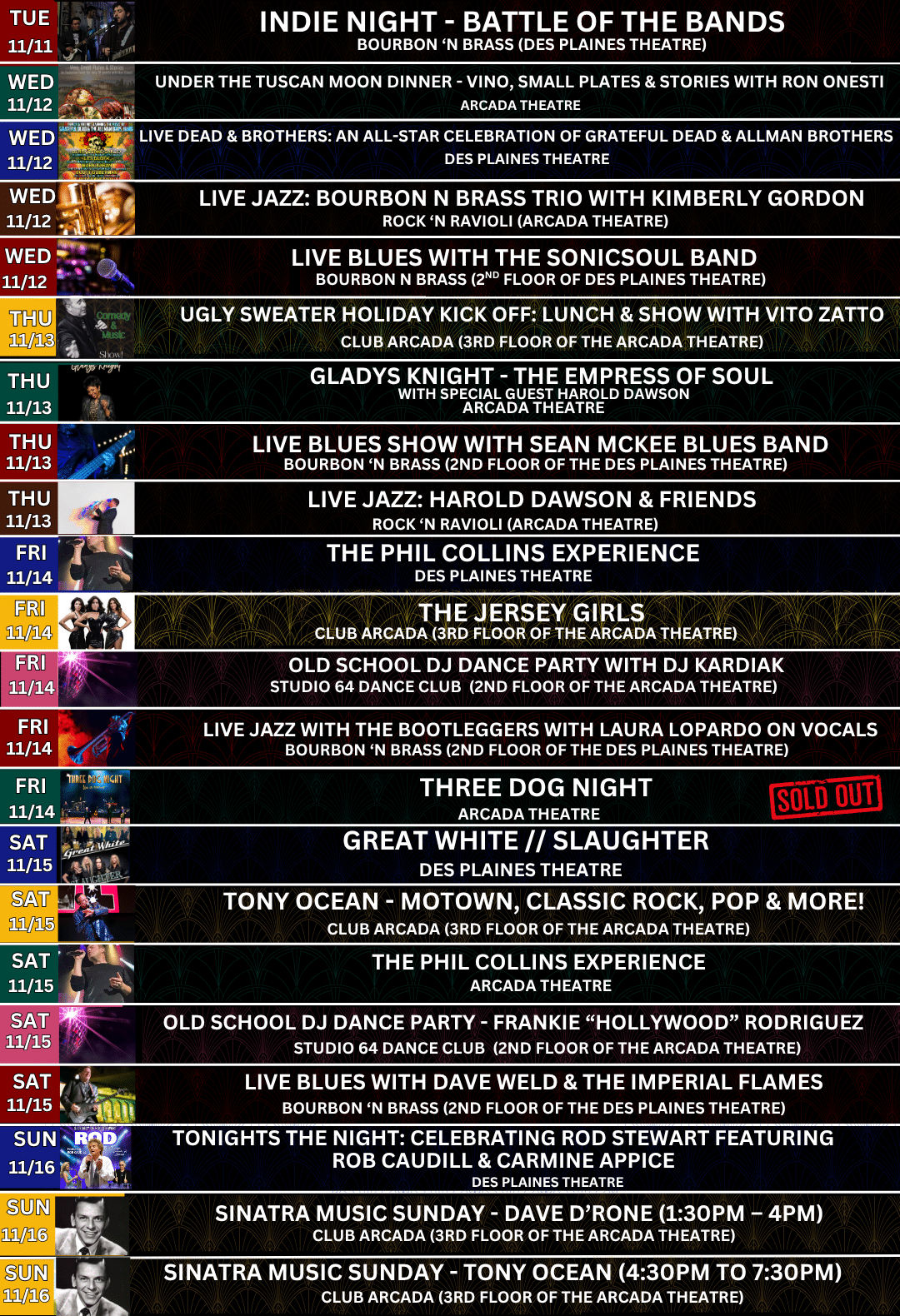 Our intimate Speakeasy, located on the 3rd floor of the Theatre, offers Jazz, Blues, Rockabilly, Motown, Disco, Classic Rock and More!