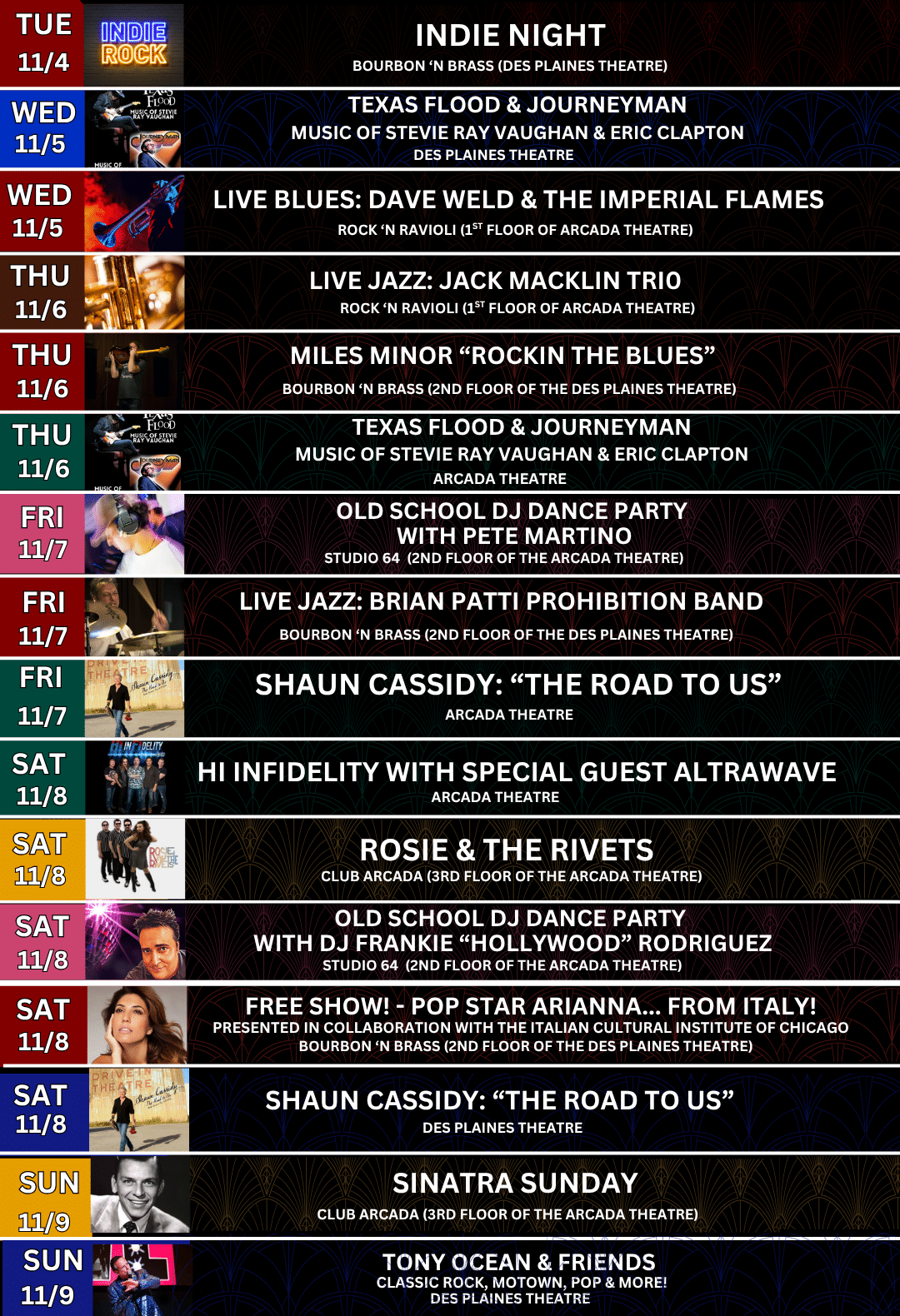 Our intimate Speakeasy, located on the 3rd floor of the Theatre, offers Jazz, Blues, Rockabilly, Motown, Disco, Classic Rock and More!