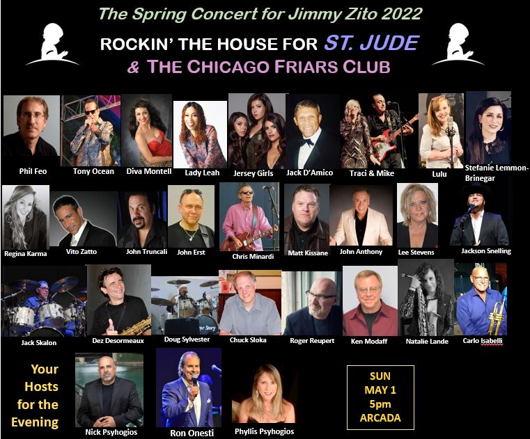 THE 2022 SPRING CONCERT FOR JIMMY ZITO – ROCKIN’ THE HOUSE FOR ST. JUDE benefitting St. Jude Children’s Research Hospital and this year we will also be supporting THE CHICAGO FRIARS CLUB. This Monster Show features THE CHICAGO HITMEN with Nick Psyhogios, Phil Feo, John Erst, Jack Skalon, Carlo Isabelli, Natalie Lande, John Truncali, Doug Sylvester, Ken Modaff, Chuck Sloka, Chris Minardi, Roger Reupert & Dez Desormeaux.