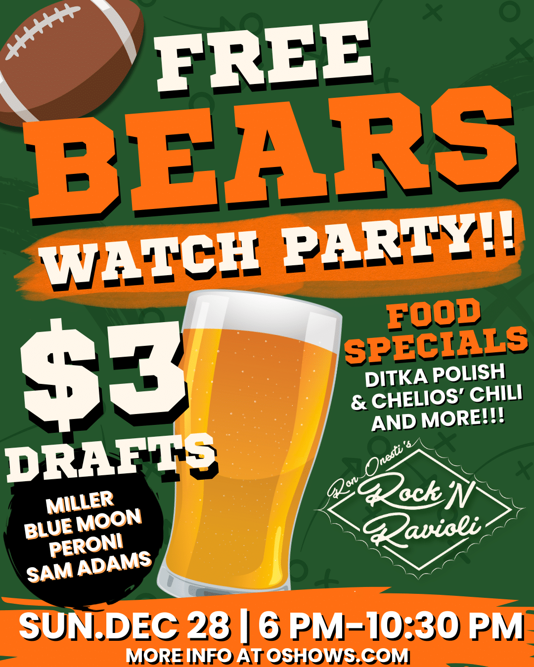 Join us for a FREE Bears vs 49ers Watch Party. $3 Drafts (Sam Adams, Peroni, Miller & Blue Moon), Ditka Polish, Chelli's Chili & More!! AND…IF (WHEN) THE BEARS WIN, every guest (present prior to halftime), gets 2 free concert tickets!!! No RSVP or ticket required. Seating is first-come-first-served!