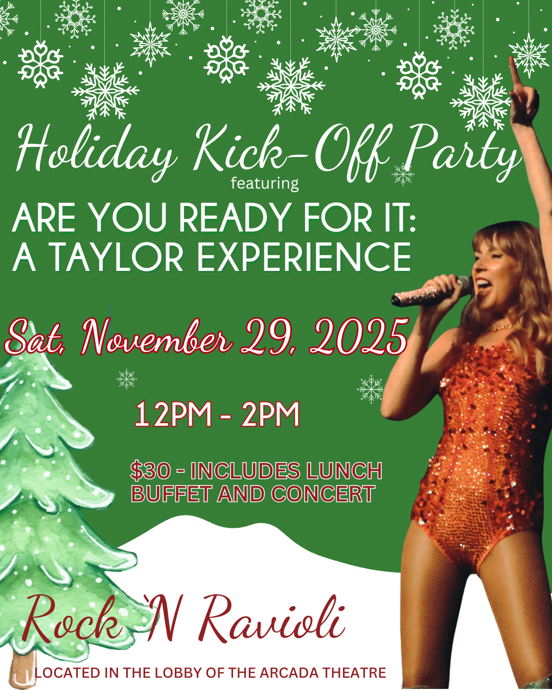 Arcada Theatre 105 E Main St, St. Charles, IL, United StatesGet ready to celebrate the holidays like never before with our Taylor Swift Tribute in Rock n Ravioli! Enjoy a festive buffet filled with delicious food, sing along to your...