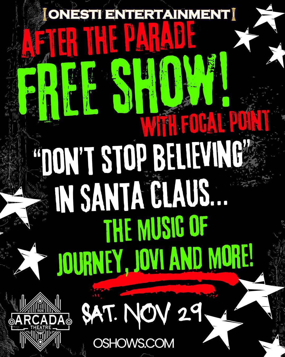 AFTER THE PARADE FREE SHOW with FOCAL POINT: “DON’T STOP BELIEVING” IN SANTA CLAUS – THE MUSIC OF JOURNEY, JOVI and MORE!