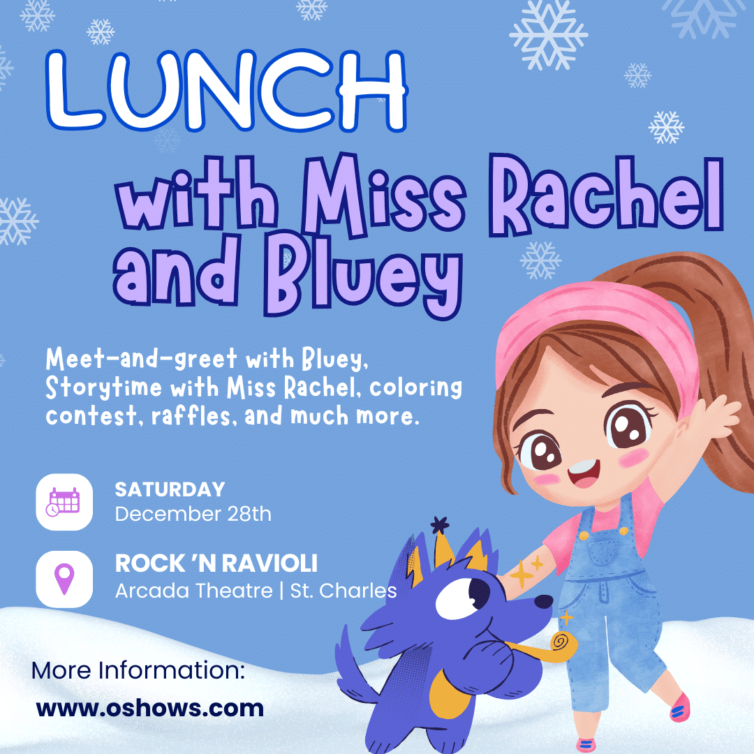 Arcada Theatre 105 E Main St, St. Charles, IL, United StatesKeep the holiday spirit alive with a delightful lunch featuring Miss Rachel and Bluey! This kid-inspired event includes a meet-and-greet with Bluey, a captivating story from Miss Rachel, a fun coloring contest, exciting raffles, and much more. For just $25 per person, your little ones will create unforgettable memories while enjoying a festive atmosphere. Don’t...